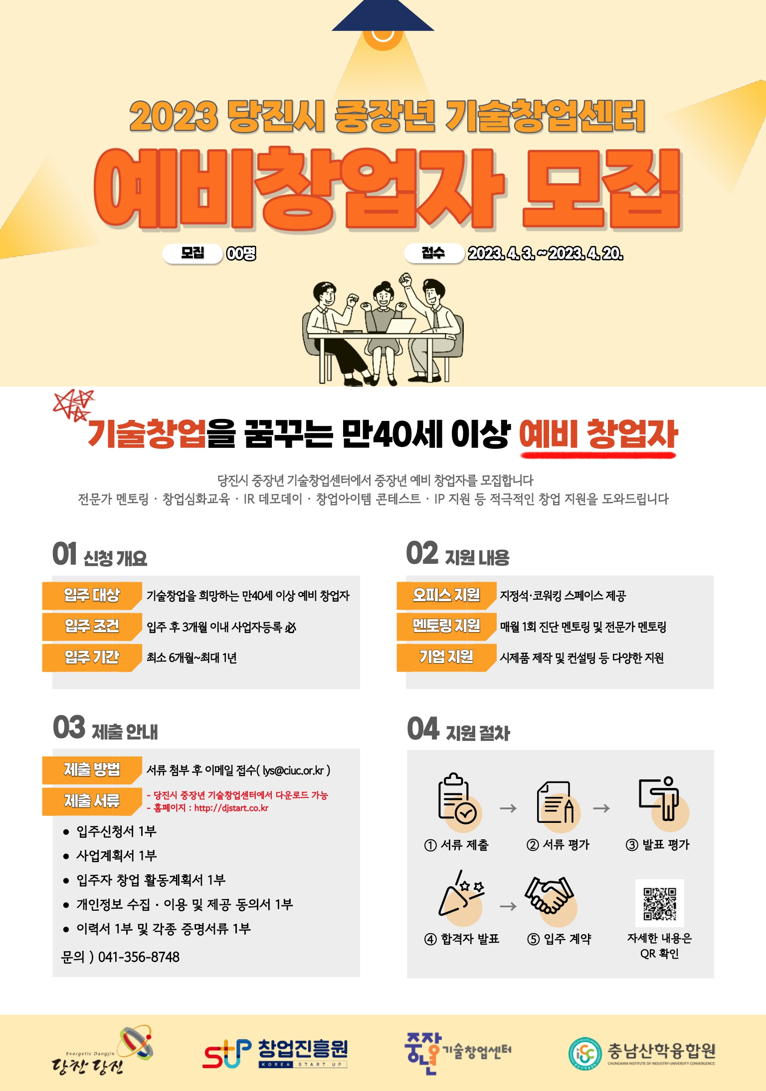 당진시 중장년 기술창업센터(☎ 041-356-8748) 또는 lys@ciuc.or.kr